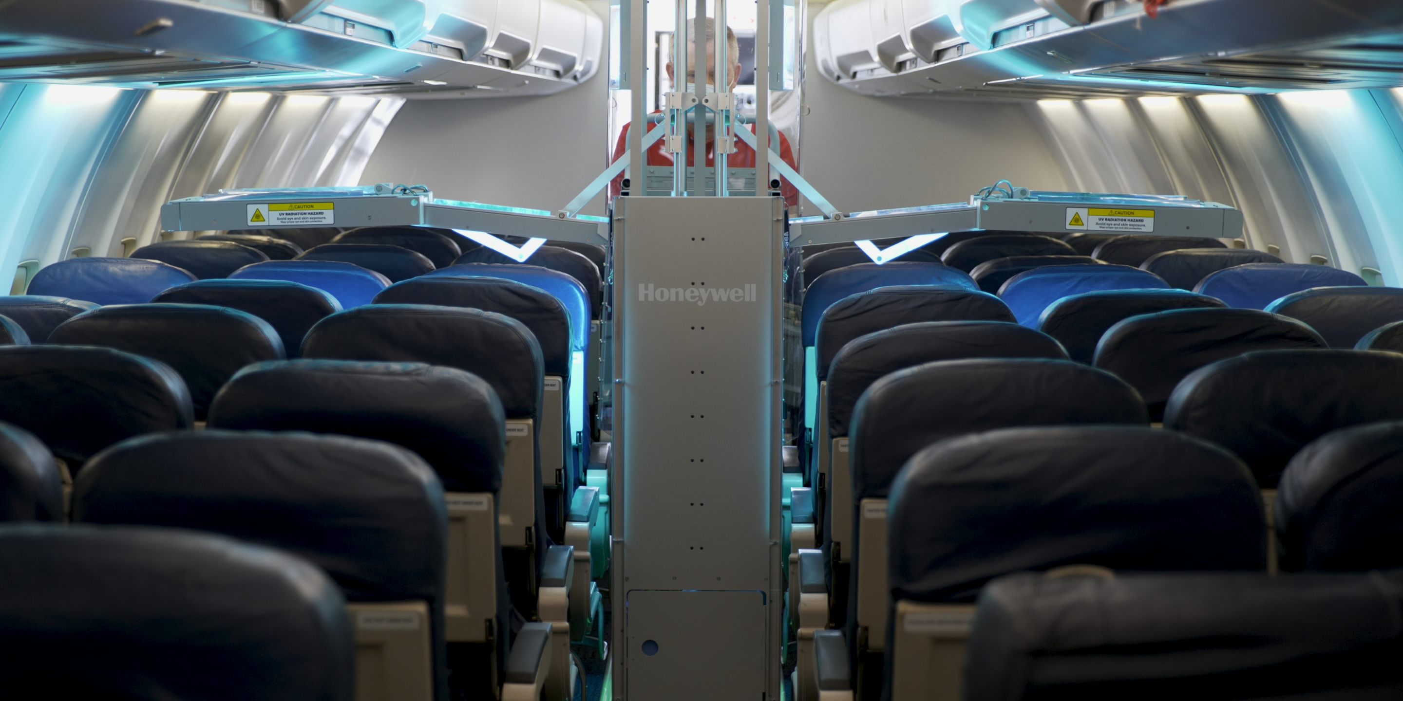 The Honeywell UV Cabin System is roughly the size of an aircraft beverage cart and has UV-C light arms that extend over the top of seats and sweep the cabin to treat aircraft surfaces. Properly applied, UV-C lights can deliver doses that clinical studies have found to be capable of reducing various viruses and bacteria, including SARS-CoV and MERS-CoV. Results vary based on UV dosage and application.