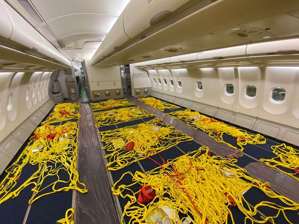 Carpeting was then reinstalled with lights indicating the 33 cargo positions. Cargo will be held in place with netting fastened to floor rails where the seats were anchored. The aircraft now has the capacity to carry over 200 cubic metres of cargo.